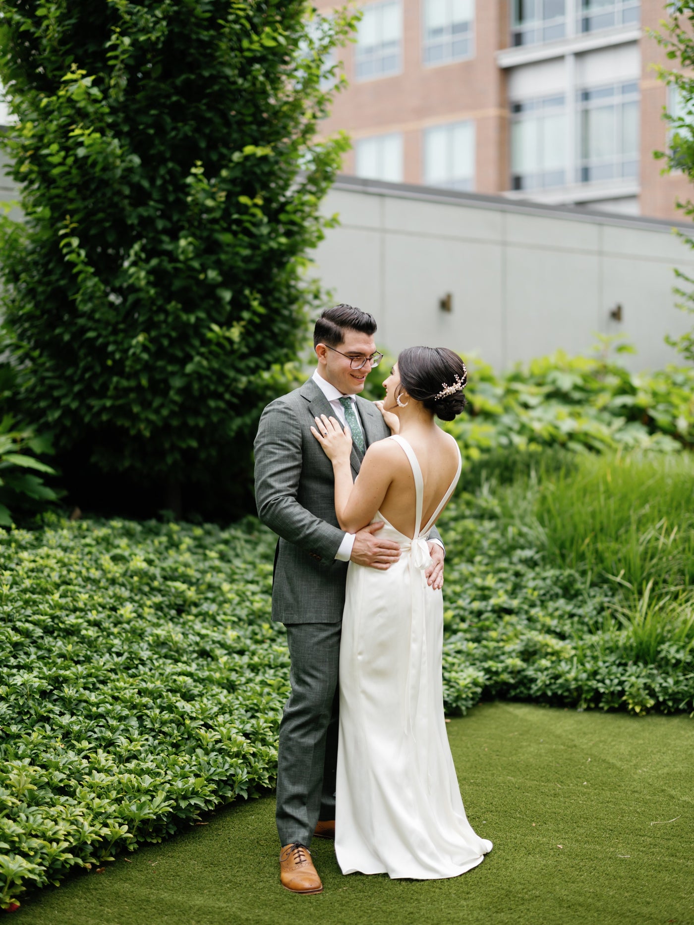 I went into the boutique with a few asks: a timeless design, a low back, within my budget. The Livvy was the first gown I tried on. I loved the silhouette – fitted, but comfortable. I was obsessed with the back! But, I thought, you can’t buy the first gown you try on! I tried one on about 15 other gowns and then returned to the Livvy. It made me feel like a movie star. Elegant, but effortless. I was comfortable but felt incredibly sexy. But not too sexy that my grandmother would disapprove! I left the store thinking “just sleep on it.” But then I promptly called the boutique when I arrived home and ordered my gown. Best decision ever! I feel proud when I tell people about my dress! Other than it is gorgeous, it comes from a designer and company that values sustainability and community. I thought long and hard about what it meant to buy a dress to be worn for a single day. I found solace in knowing that Catherine Deane is committed to eco-friendly production and charity.