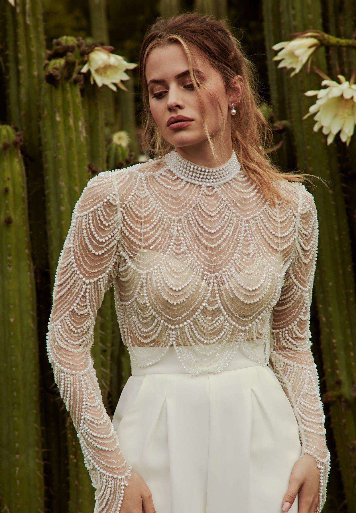 Styled here with the Anya Topper worn over the Sigrid Bodice in peach.