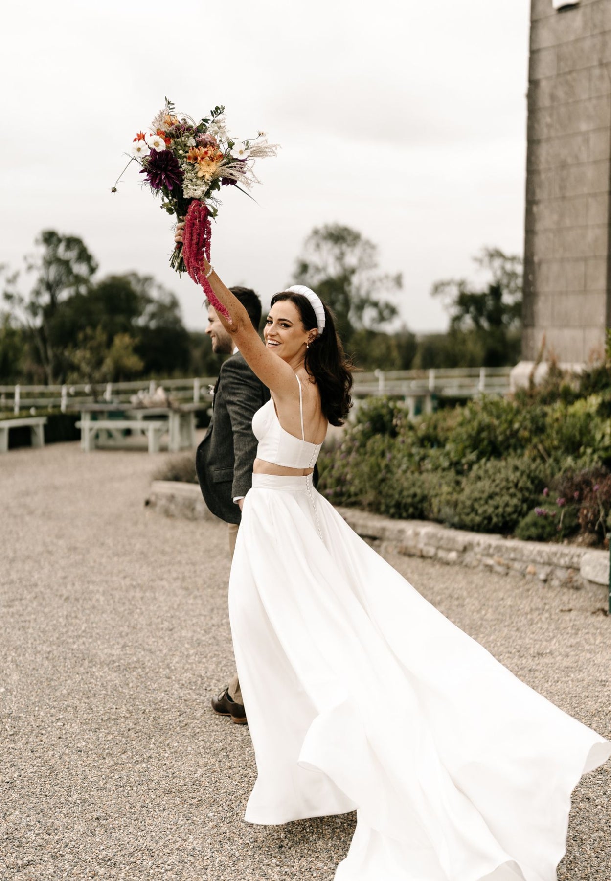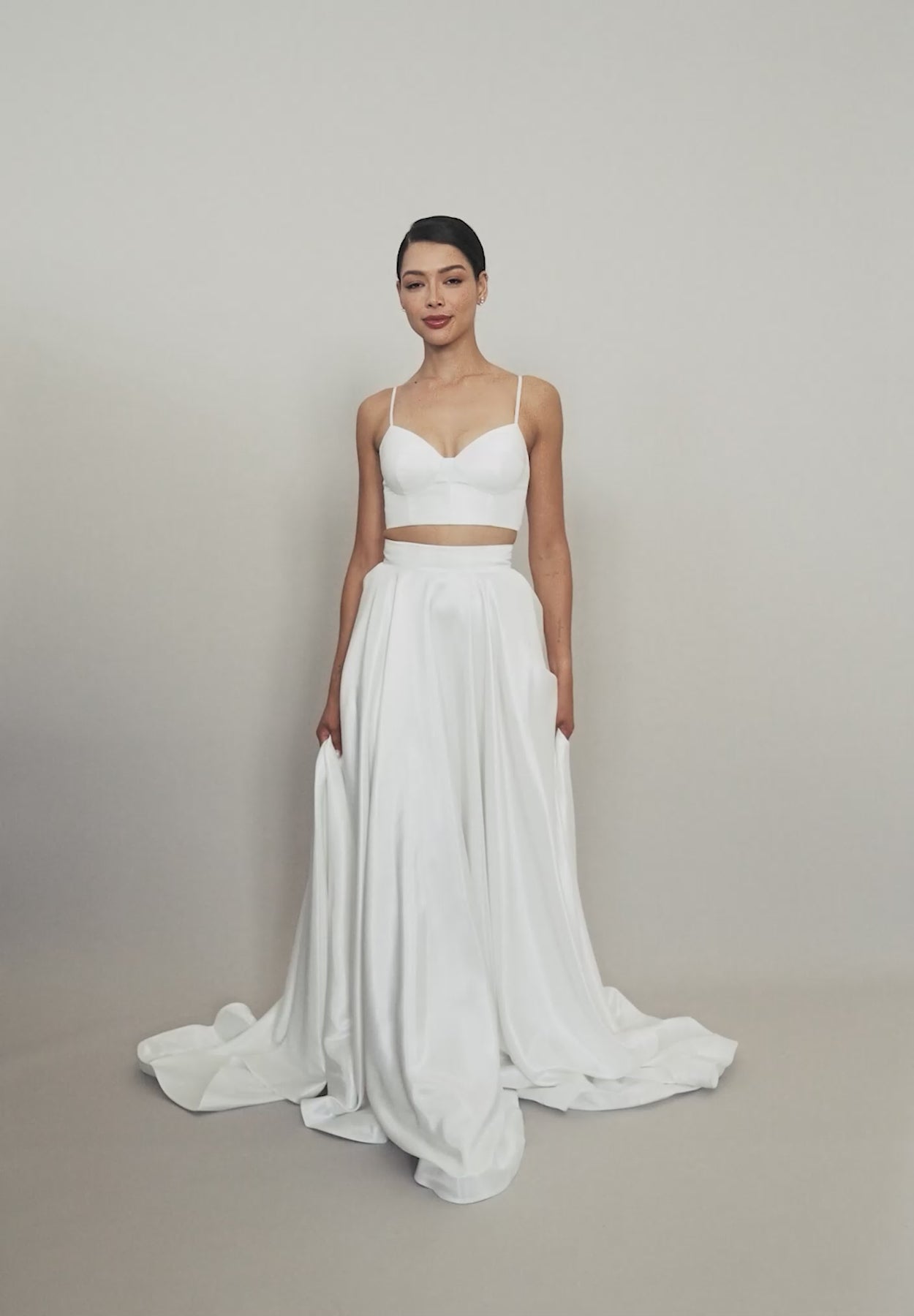 The voluminous Anna Skirt is cut from crips, oyster toned Thai Satin. The wide high waistband accentuates the small of the waist while the full circle cut of the skirt drapes dramatically to the floor, ending in a sweeping train. Horse hair trim gives added structure to the hemline while delicate buttons close the center back from waist to hip level. The addition of inseam side pockets adds a modern touch to this traditional bridal silhouette.