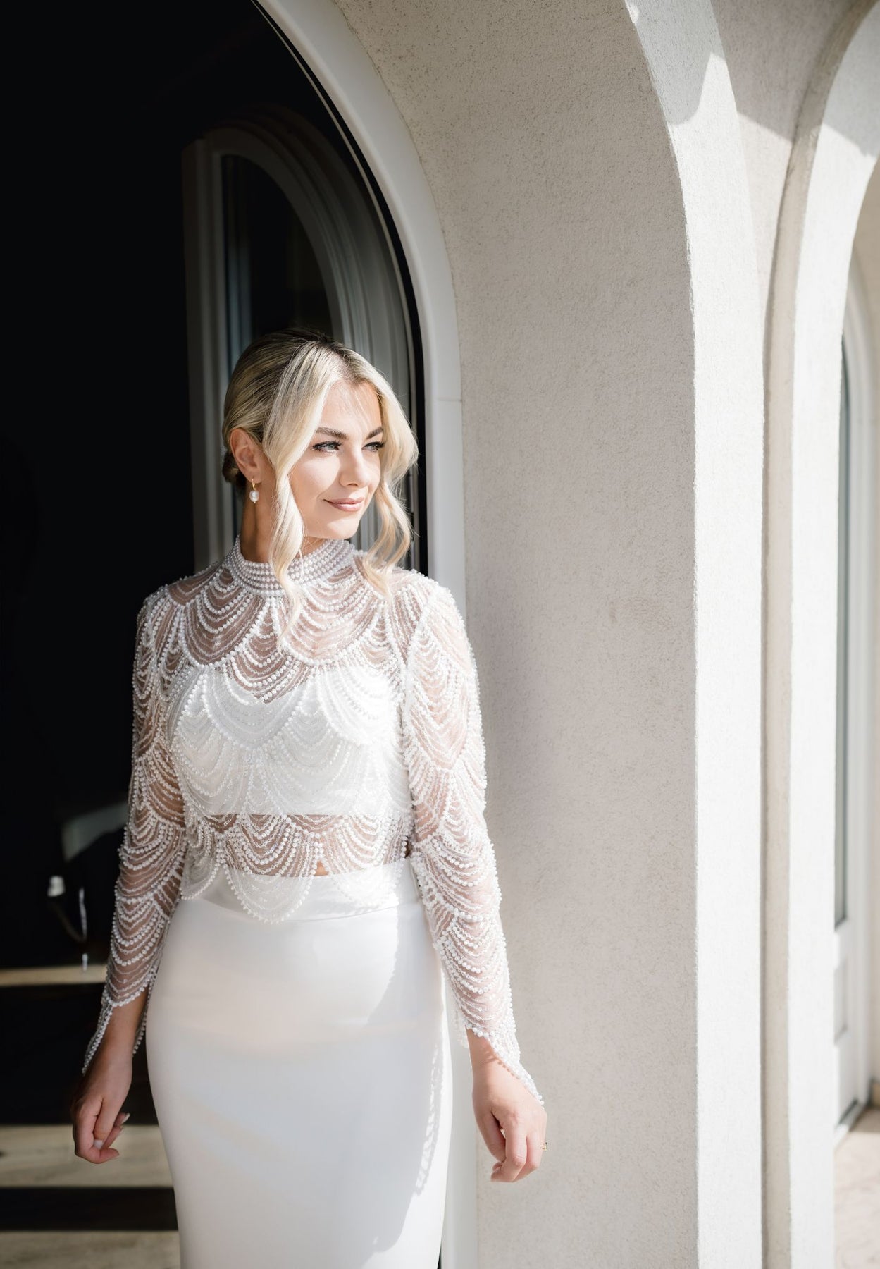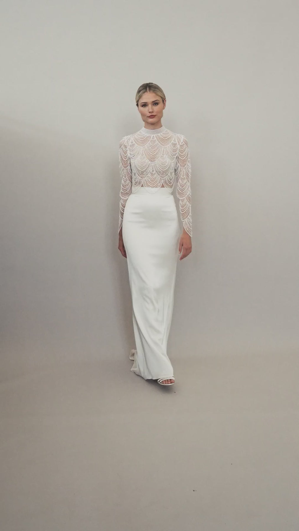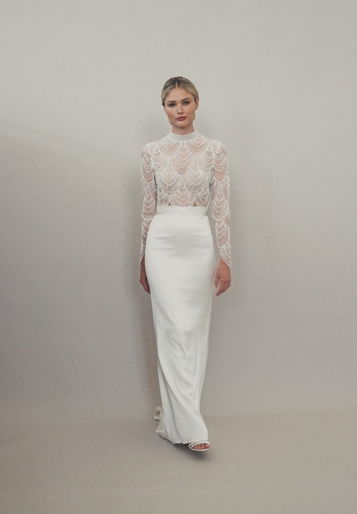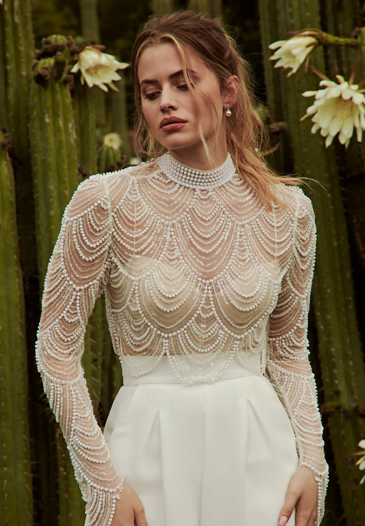 The Anya Topper is cut from a scalloped, faux pearl and sequin-adorned tulle, creating a dramatic scalloped hemline and curved wrist details. This sheer topper features semi-fitted long sleeves and a high collar that has been meticulously hand-beaded in a process that takes more than 10 hours of work. The back of this decorative top closes with a row of faux pearl buttons. The Anya Topper is designed to be worn over your choice of bralette.