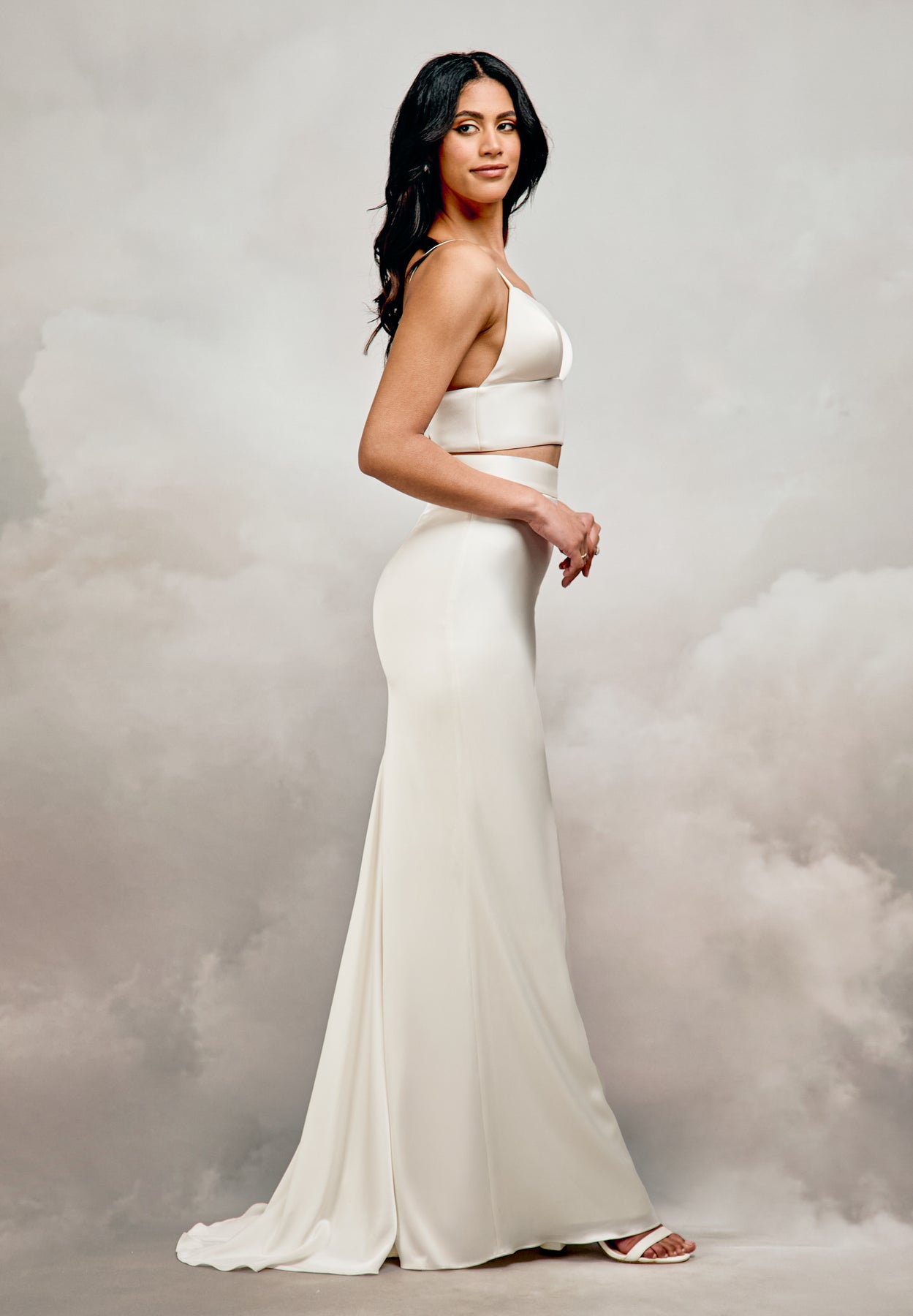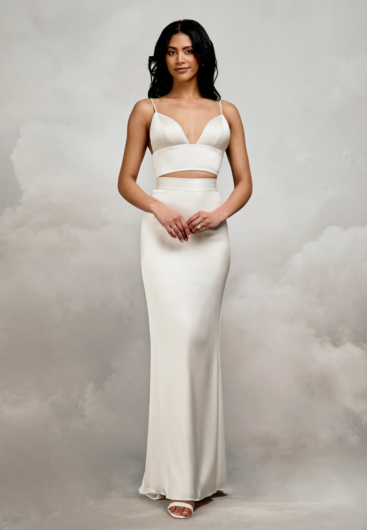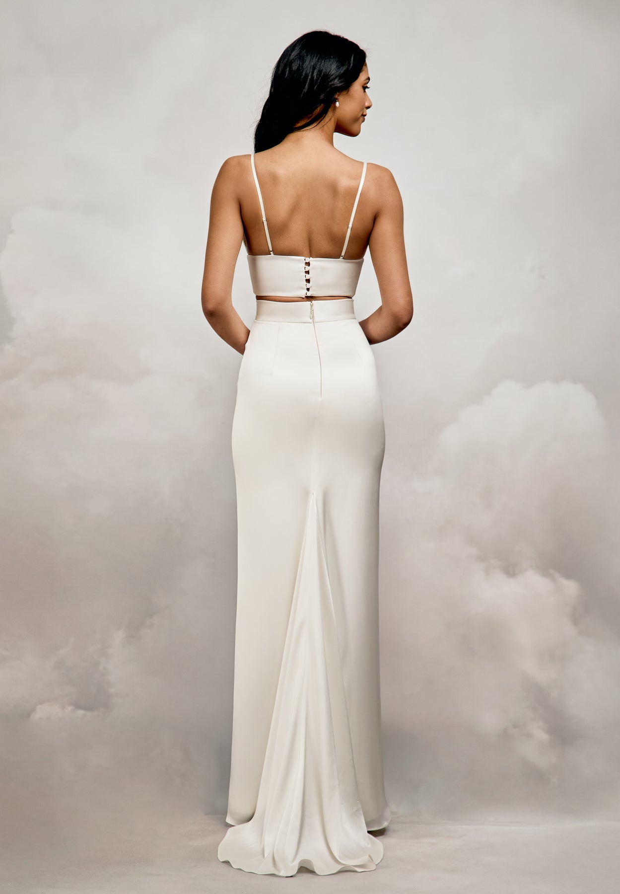 The versatile Bastion Bralette pairs effortlessly with skirts or trousers, while working equally well as an undergarment under an array of our tops. Cut from luxurious heavy satin, the flattering triangular bust cups conceal bust support held by delicate, skinny straps. Satin-covered buttons add interest to the back opening of the wide under-bust panel.