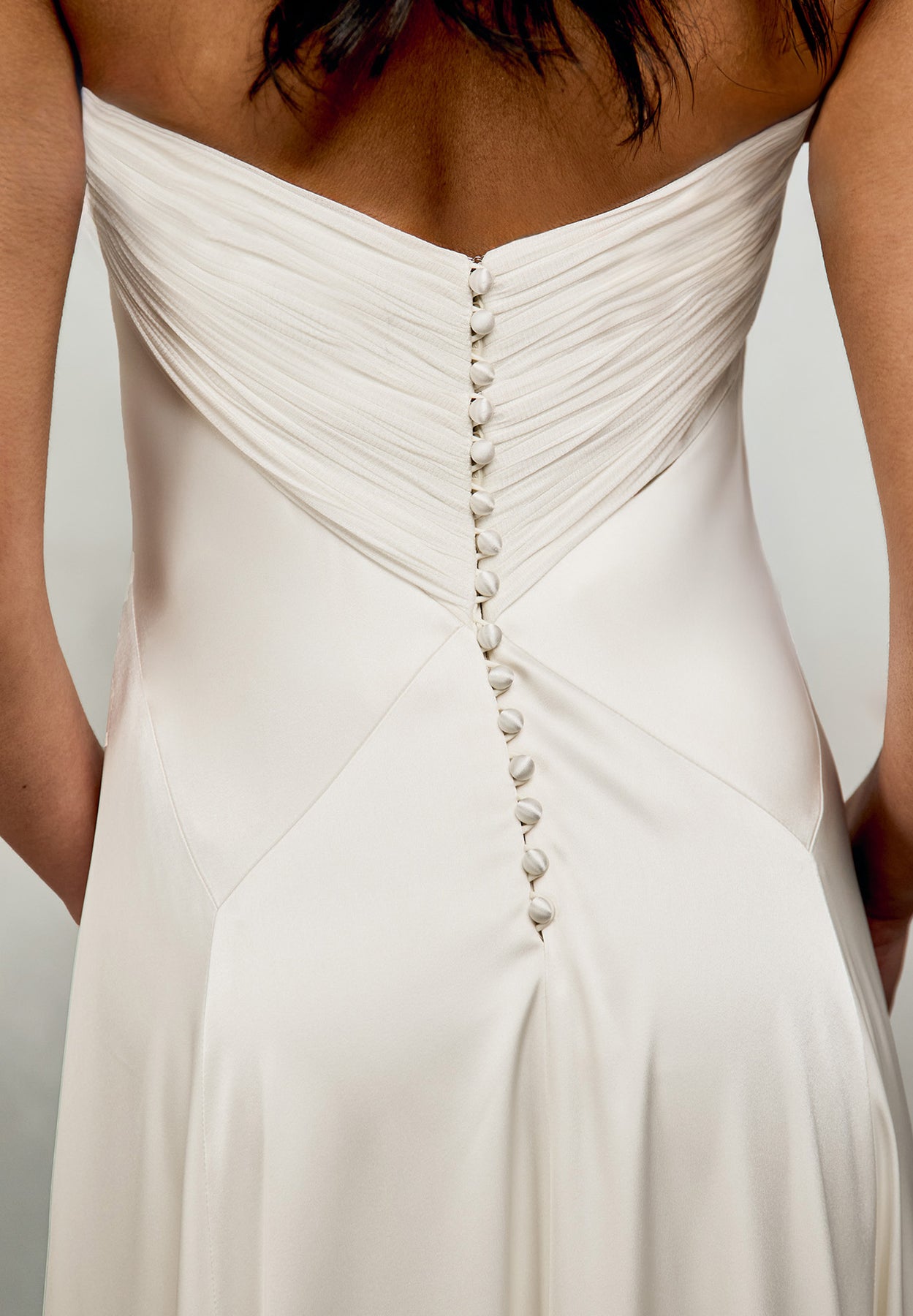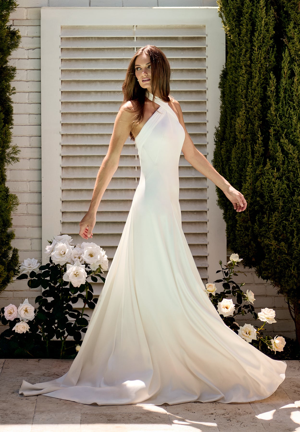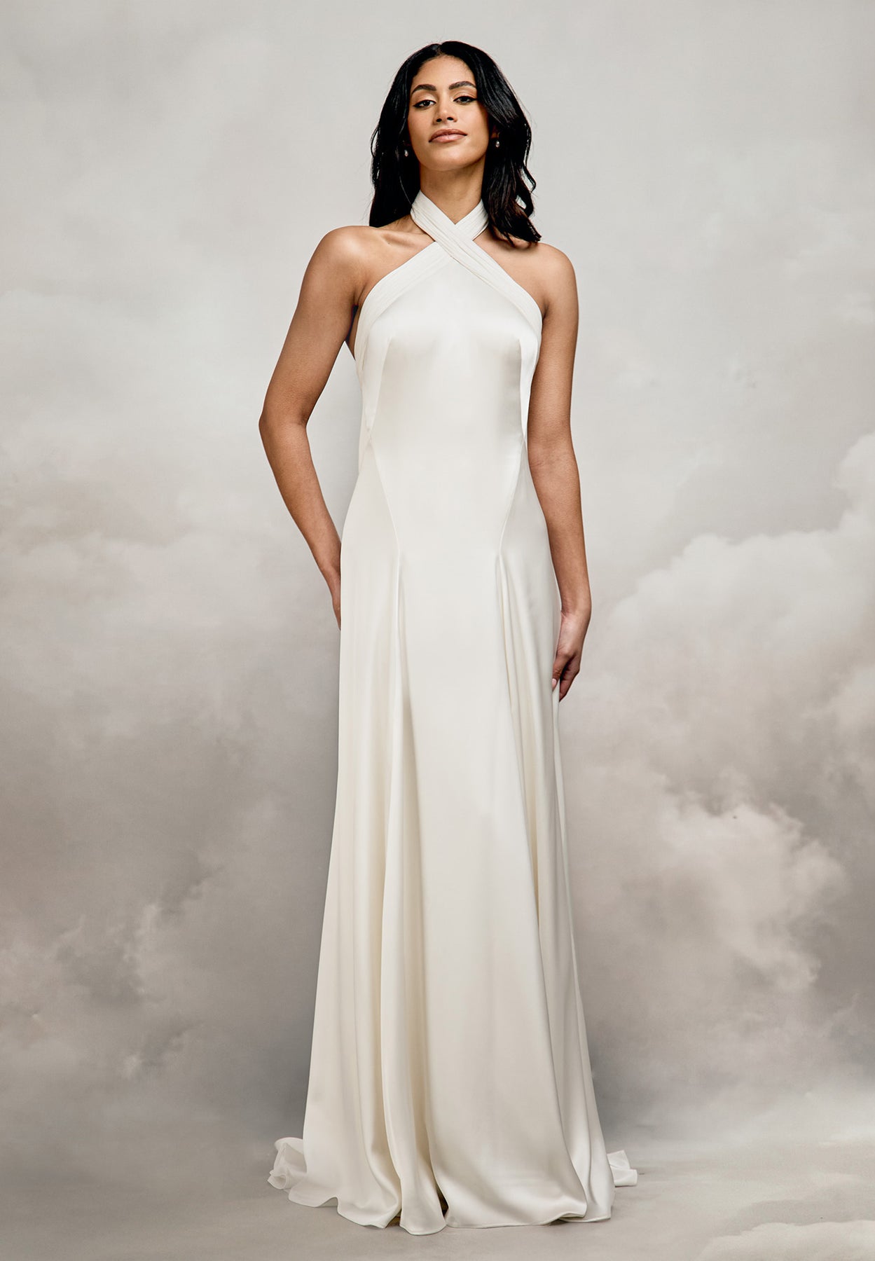 The Emerson Gown perfectly marries vintage design elements with modern tailoring. Designed for the bride who values understated luxury, this full-length halterneck wedding dress mixes clean lines with intricate seamwork. Cut from luxurious heavy satin and lined in eco satin, the Emerson Gown falls into a soft A-line silhouette that subtly skims the body thanks to its bias cut panels. The neckline is elevated by contrasting, gathered 100% silk tulle, wrapping around the front and back before extending to frame the half-open back. Diamond-shaped seams cut flattering lines over the hips, continuing through to the back of the gown to sculpt and flatter the figure. The result is a silhouette that feels both fluid and intentionally tailored. Designed with built-in support, the Emerson Gown offer a comfortable wearing experience without the need for additional undergarments. The back opens with satin-covered buttons at the halterneck and over the invisible zip. A left front skirt split adds a fashion-forward element. Finished with a modest train, the Emerson Gown is ideal for brides seeking timeless elegance with contemporary appeal.