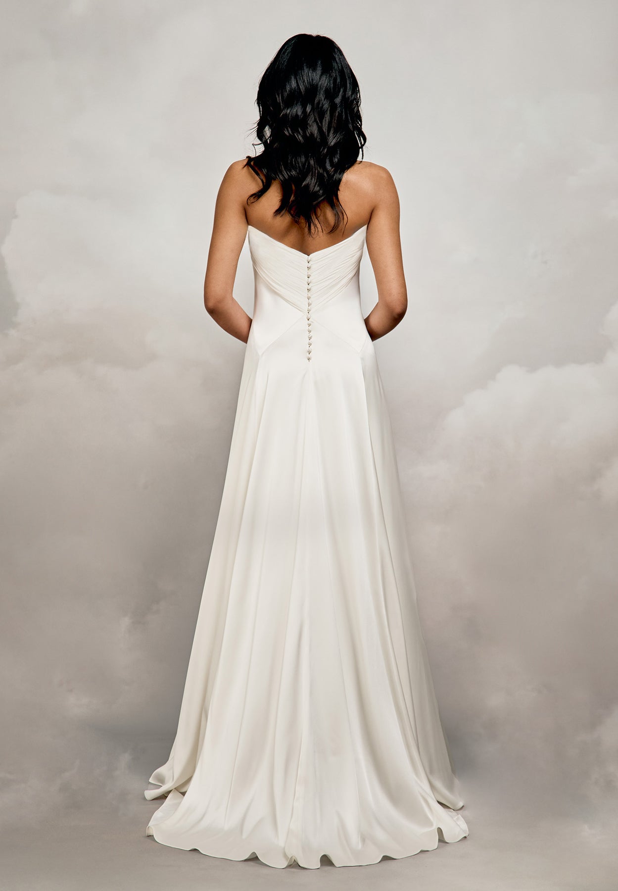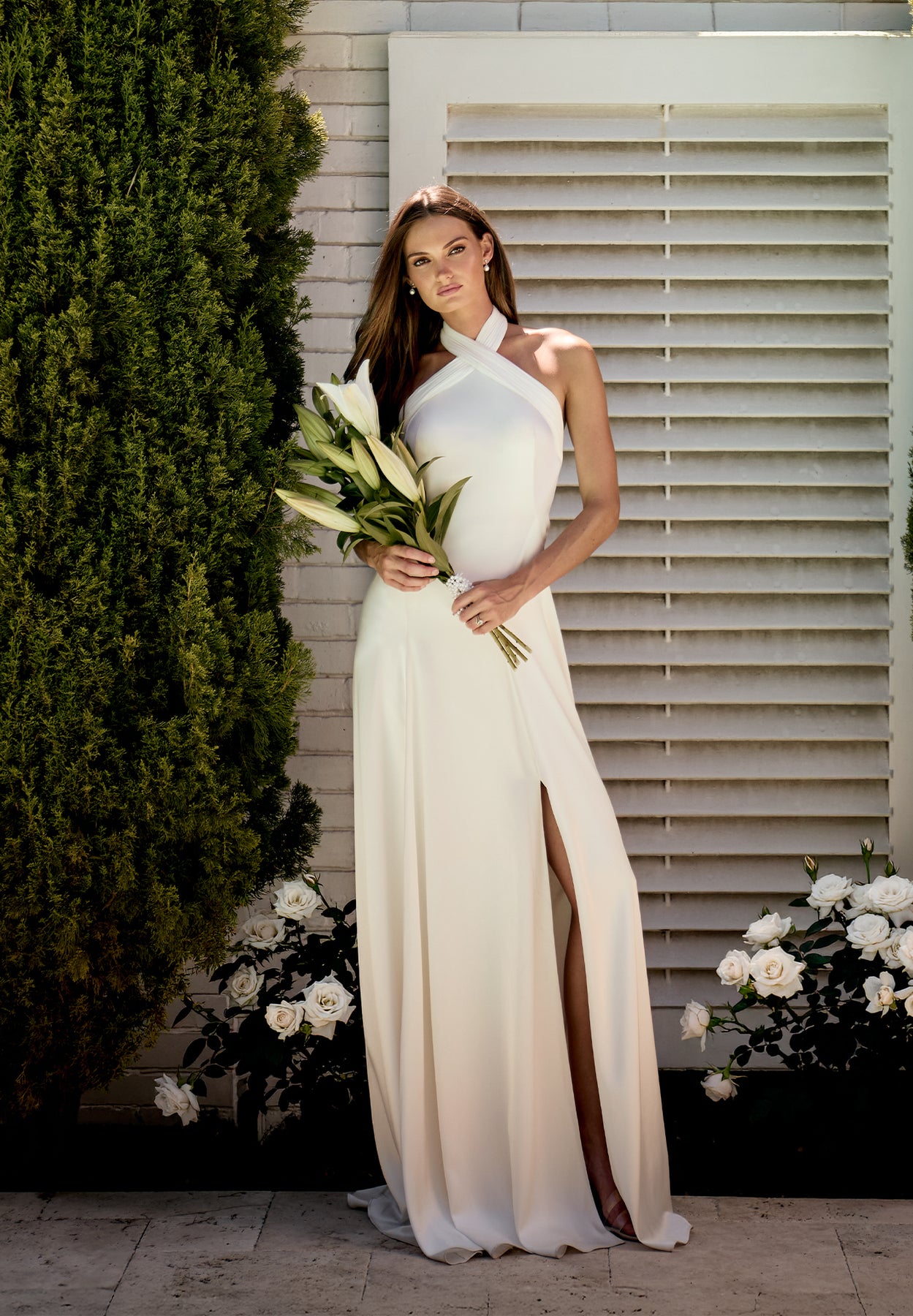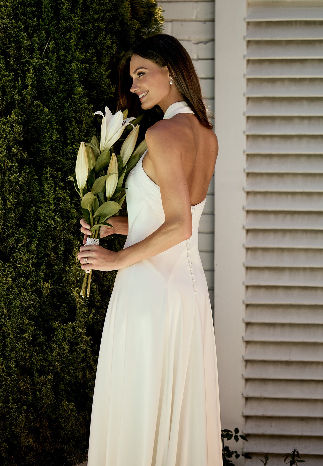 The Emerson Gown perfectly marries vintage design elements with modern tailoring. Designed for the bride who values understated luxury, this full-length halterneck wedding dress mixes clean lines with intricate seamwork. Cut from luxurious heavy satin and lined in eco satin, the Emerson Gown falls into a soft A-line silhouette that subtly skims the body thanks to its bias cut panels. The neckline is elevated by contrasting, gathered 100% silk tulle, wrapping around the front and back before extending to frame the half-open back. Diamond-shaped seams cut flattering lines over the hips, continuing through to the back of the gown to sculpt and flatter the figure. The result is a silhouette that feels both fluid and intentionally tailored. Designed with built-in support, the Emerson Gown offer a comfortable wearing experience without the need for additional undergarments. The back opens with satin-covered buttons at the halterneck and over the invisible zip. A left front skirt split adds a fashion-forward element. Finished with a modest train, the Emerson Gown is ideal for brides seeking timeless elegance with contemporary appeal.