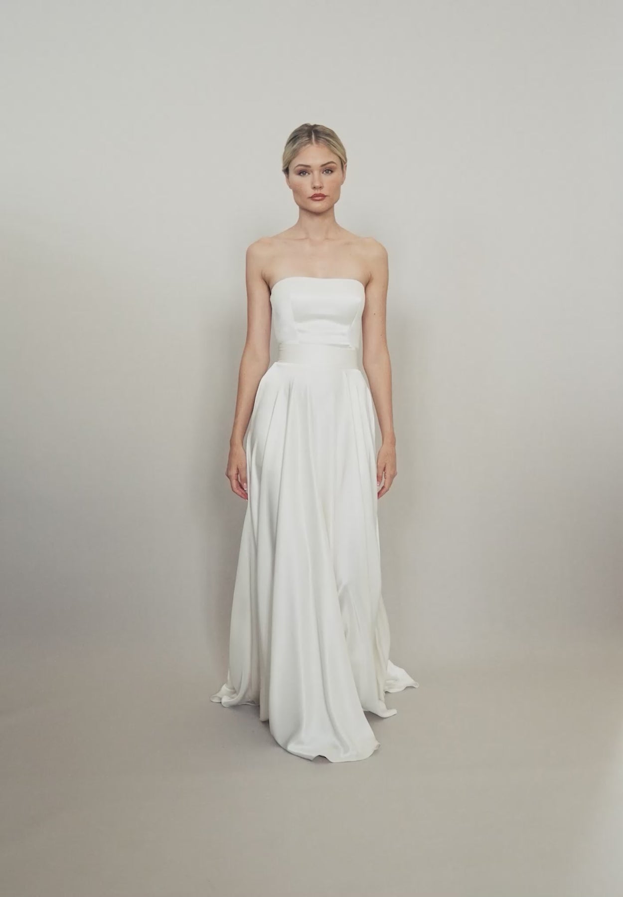 Eva is modern, effortless and versatile. This minimalist straight neckline bodice is cut and tailored from luxurious heavy satin and her pairing possibilities are endless! The Eva Bandeau features clean and minimal seam lines. She is boned throughout for a comfortable fit and sewn-in bust cups provide support for this strapless bodice.