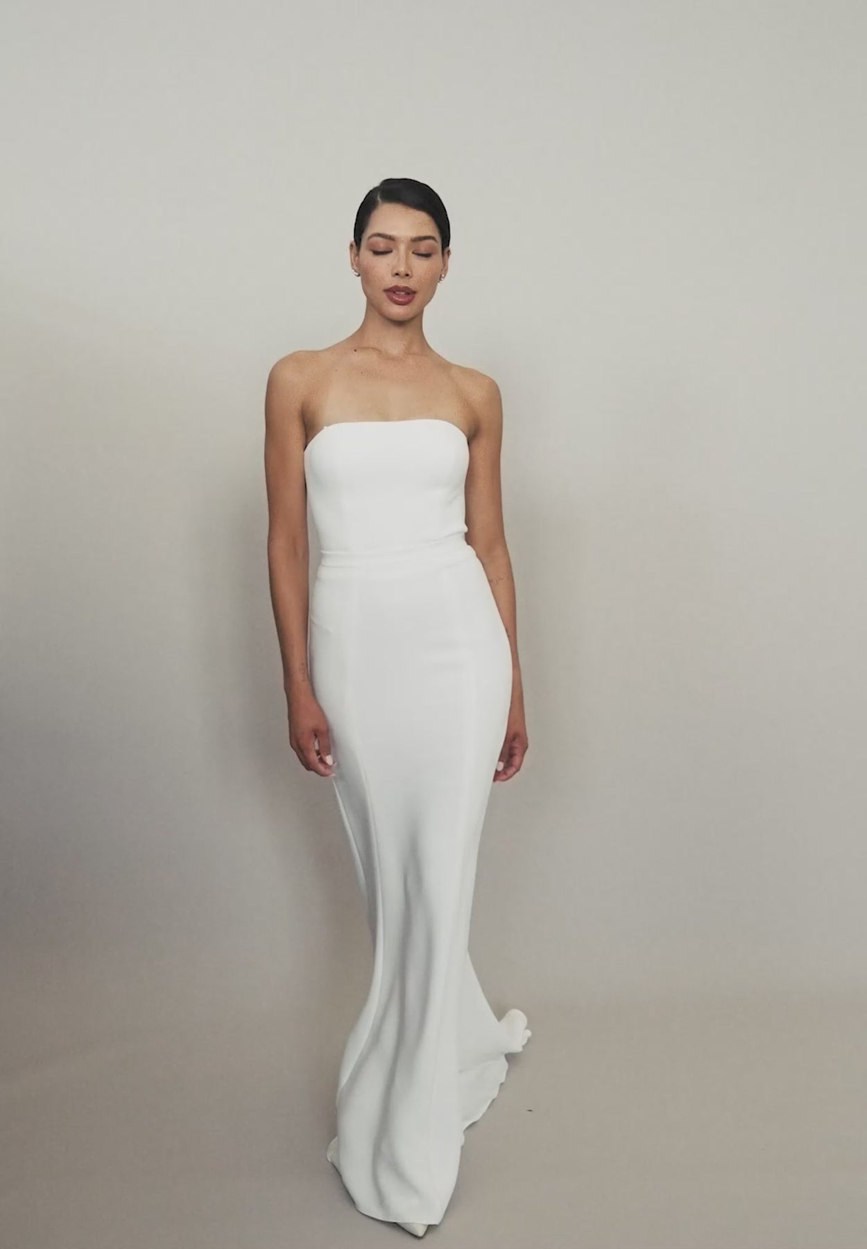 The Eva Bandeau in bone white heavy crepe is modern, effortless and versatile. This minimalist straight neckline bodice is perfect for styling with an array of our bridal skirts and trousers. The Eva Bandeau is boned throughout for a comfortable fit, and sewn-in bust cups provide support for its strapless foundation. The center back of this bodice opens with a fully openable zip.