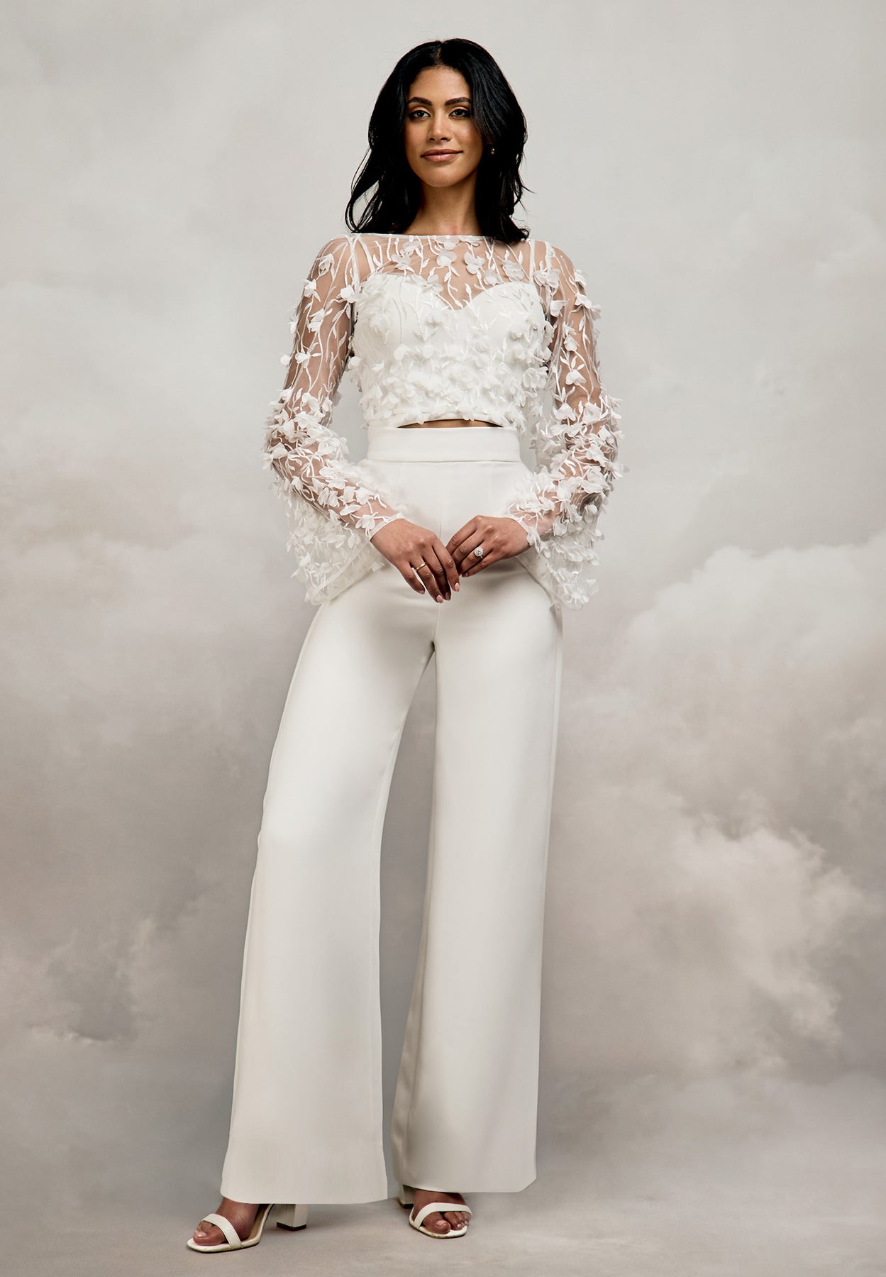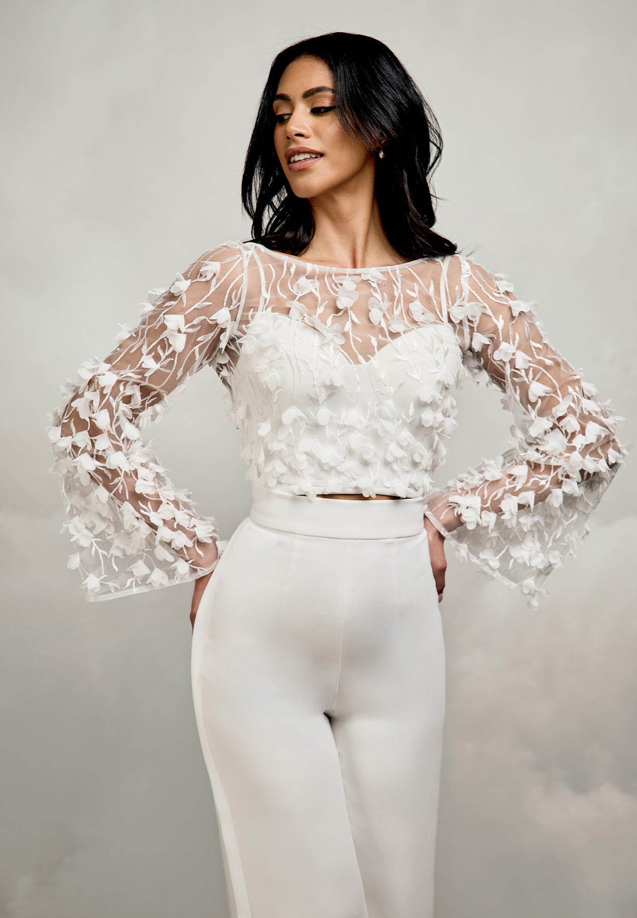 The Evie Top is a beautifully expressive layering piece, designed to add texture and coverage. Crafted from sheer tulle, this bridal top is adorned with 3D floral petals and delicate embroidered details, creating an ethereal finish that feels light yet elevated. An elegant boat neckline frames the shoulders, while long bell sleeves introduce graceful movement. The semi-fitted bodice skims the body comfortably, offering a flattering silhouette without feeling restrictive. Designed to be worn over a bralette of your choice, the Evie Top allows for personalised styling. The hemline finishes in the waist, making this top perfect for styling with an array of our heavy crepe skirts and trousers. Centre back opens with crepe-covered buttons and loops. Perfect for brides seeking added coverage without heaviness, the Evie Top offers a versatile way to introduce texture and softness into your contemporary bridal ensemble.