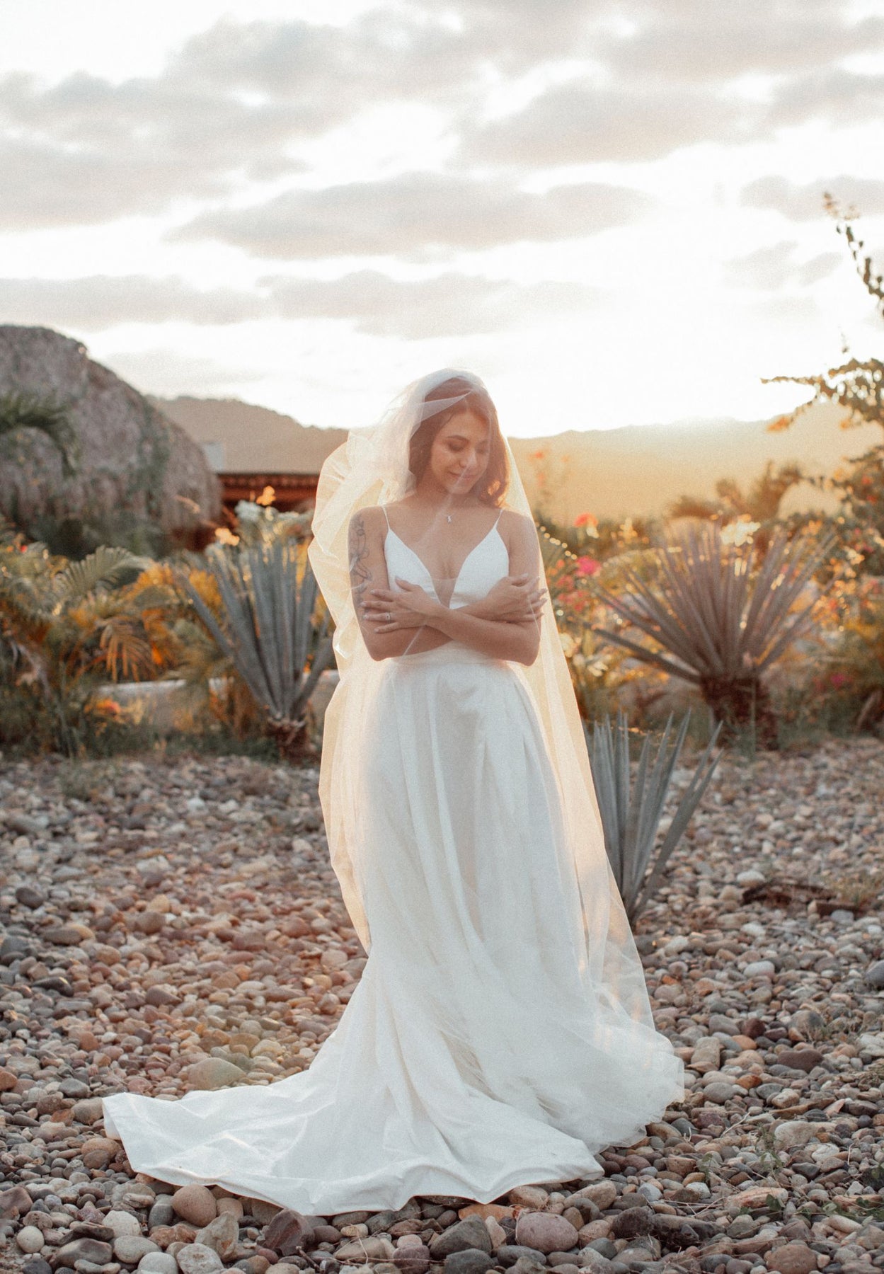 Our 100% silk dupion Halo Gown perfectly marries modern design elements with a classic bridal silhouette. Her structured, plunging bodice flows into a dramatic and voluminous skirt and train. Delicate straps ensure a comfortable fit for this plunging front V-neck style with low open back. The attached waistband detail cinches in the small of the waist to create a figure flattering silhouette and her show stopping leg split and dramatic train makes Halo the perfect wedding gown for the daring romantic bride!