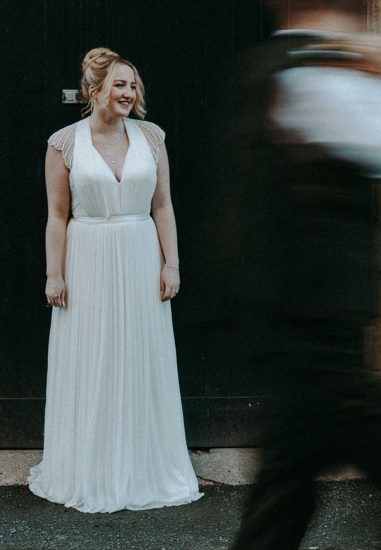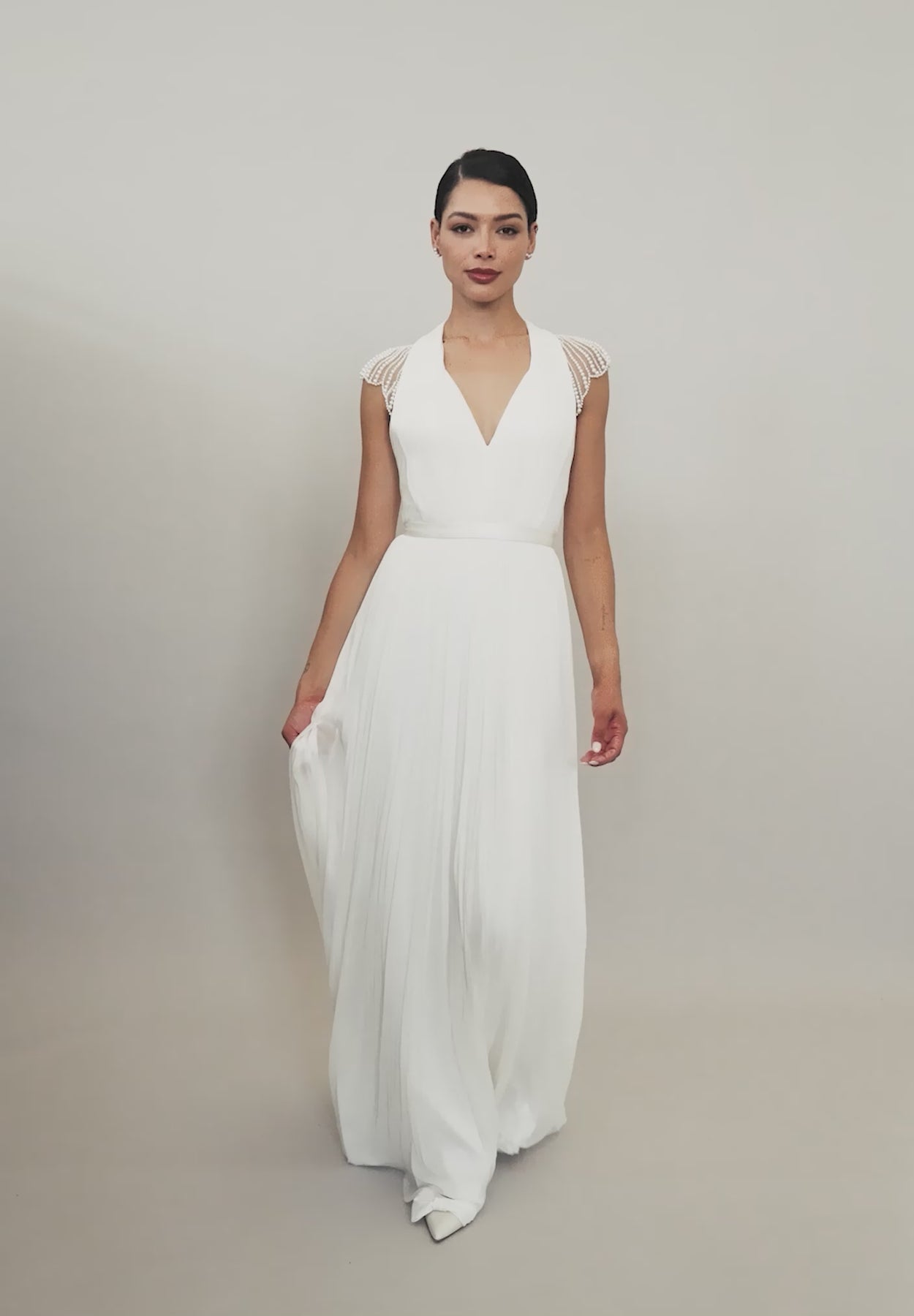 The full-length Kellyn Gown is draped in softly gathered, oyster coloured silk tulle, featuring a demure plunging V-neckline that wraps around the back of the neck in a halter design. One of the most striking features of this wedding dress is the sheer tulle back and sleeves that come down from under the halter style lines. The back and sleeves are adorned with over 30 hours of meticulously hand-beaded pearls in a radial design. Subtle scallops finish the edges of the sleeves. Built-in bust cups and boning, concealed within the front bodice ensure a comfortable fit with a relaxed fitting skirt that ends in a sweeping train.
