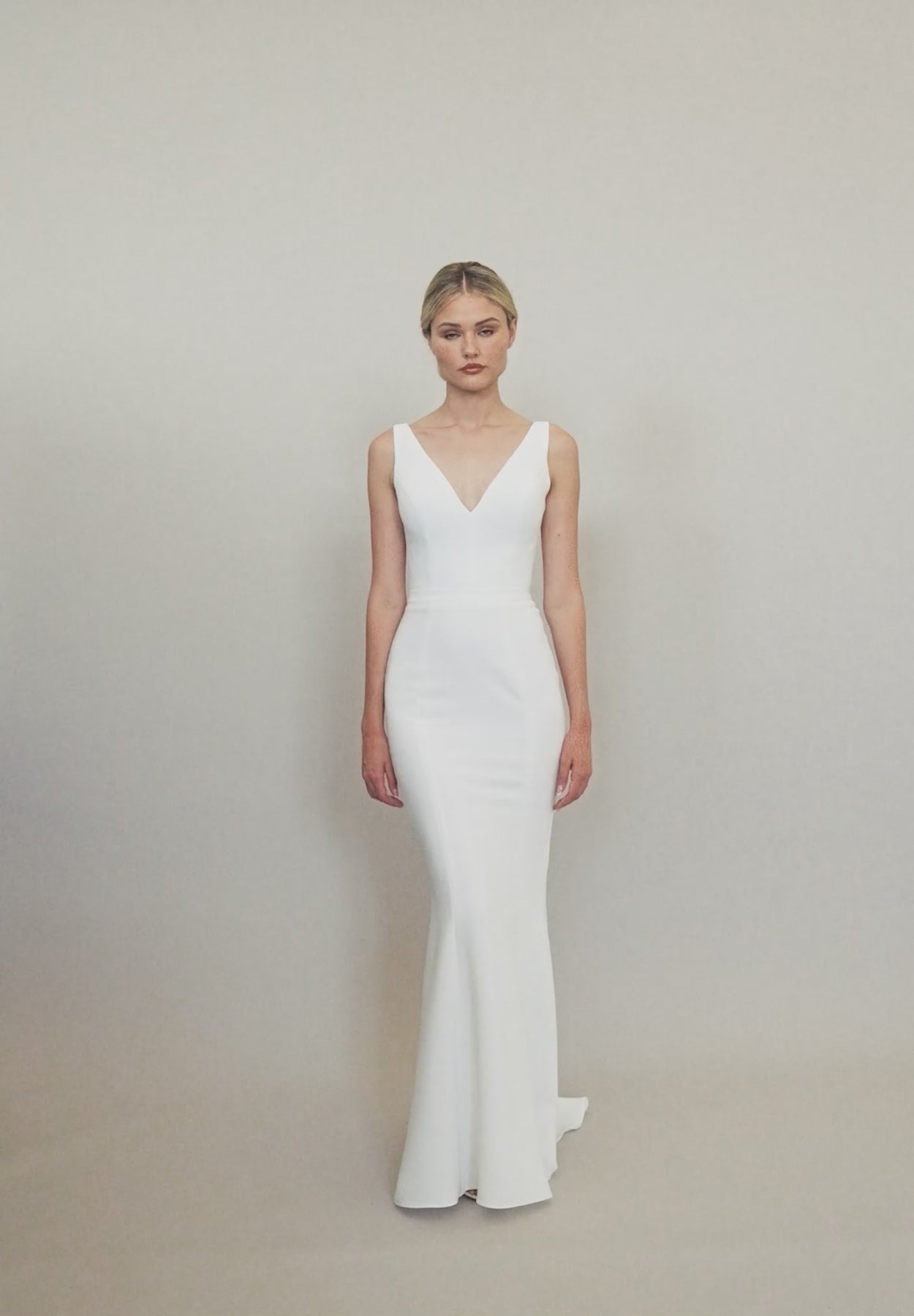 The Les Skirt is cut from luxurious, bone white heavy crepe. A thin high waistband cinches in the waist while princess seams that flare out from just above the knees create a figure-flattering trumpet silhouette that finishes with a train at the back.