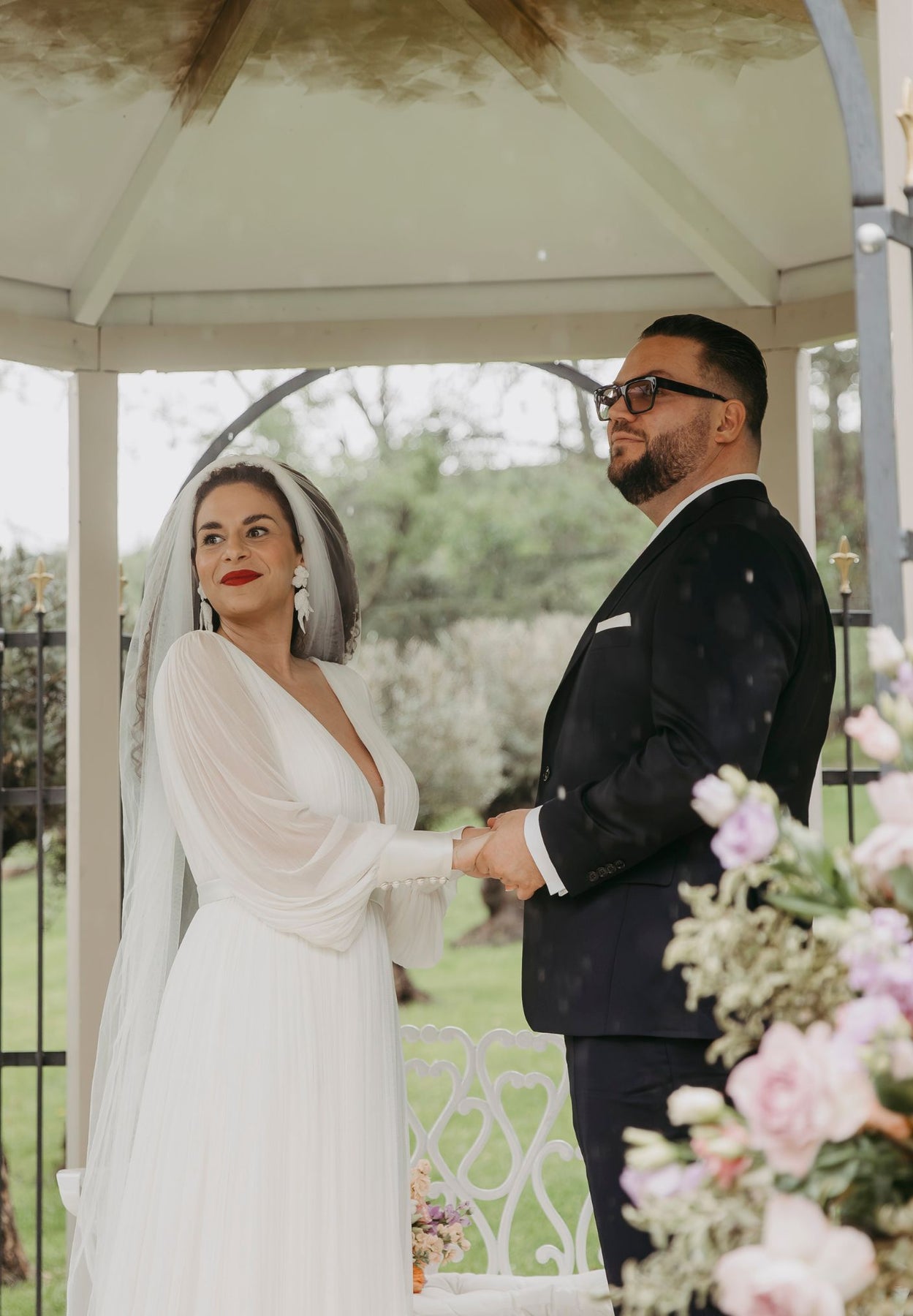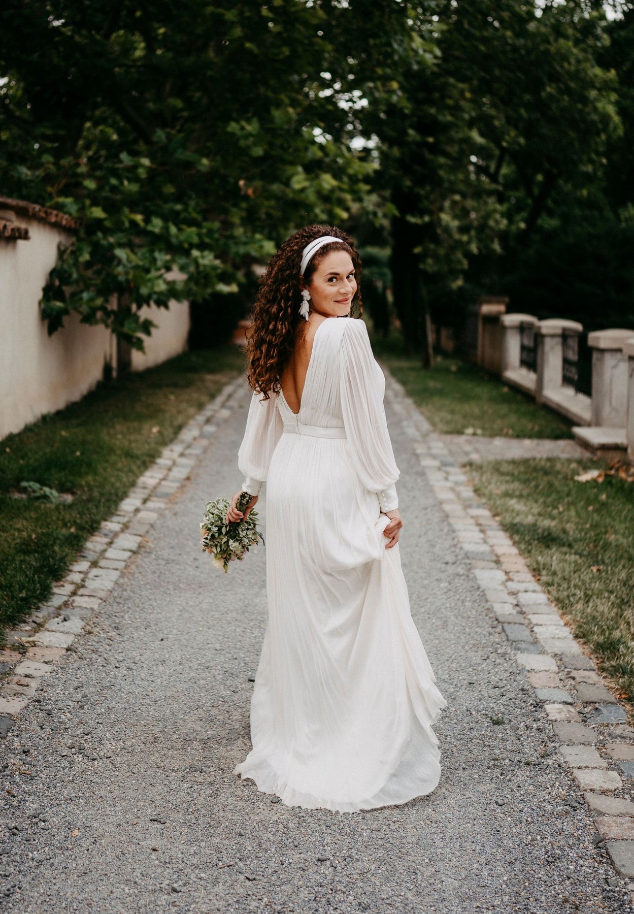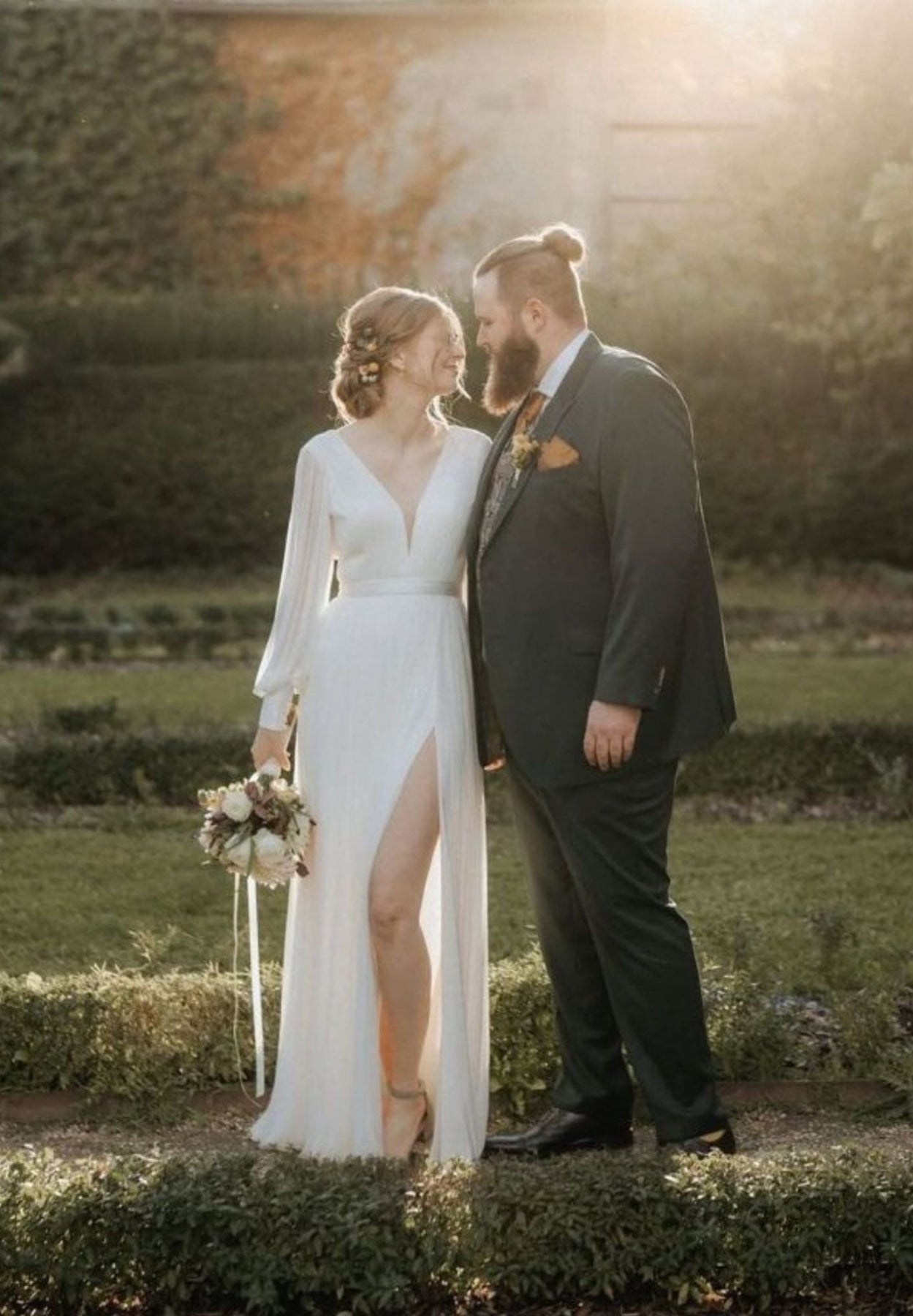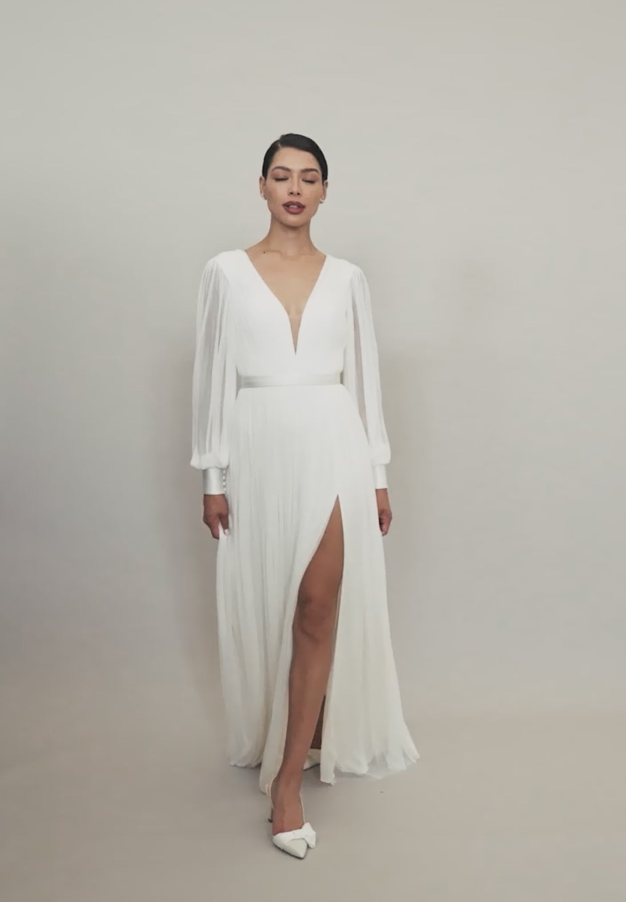 The full-length, silk tulle Levi Gown features gathered details throughout the bodice, sleeves and skirt. The plunging V-front neckline and open V-back draw the eye to the small of the waist, cinched in with a sewn-on silk satin waistband. Voluminous sheer silk tulle sleeves, elegantly finished with silk satin statement cuffs, add a dramatic element to this romantic, oyster coloured wedding dress. The A-line skirt cascades to the floor in layers of gathered silk tulle and eco satin lining, while a demure side front leg split reveals a hint of leg. The skirt features a sweeping train.