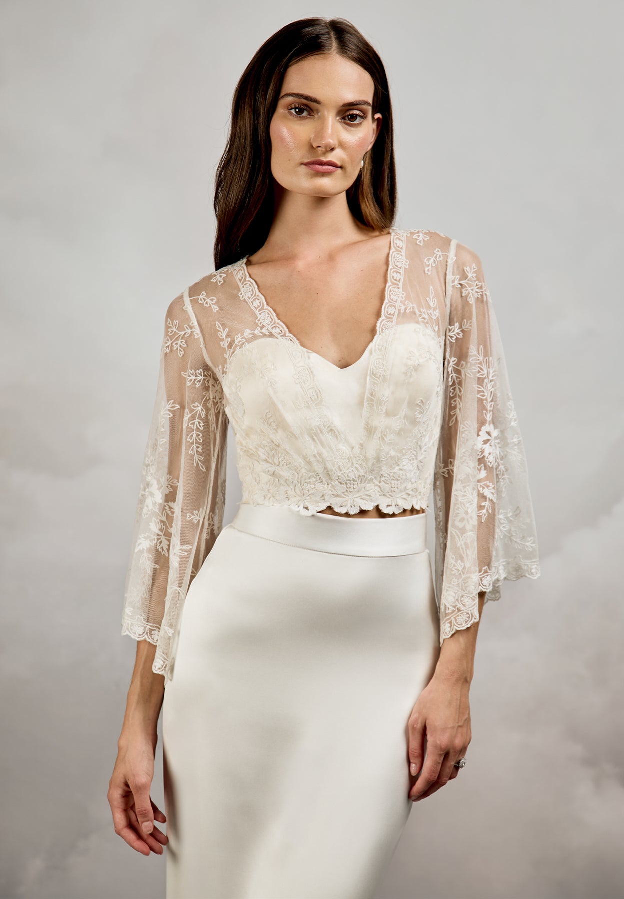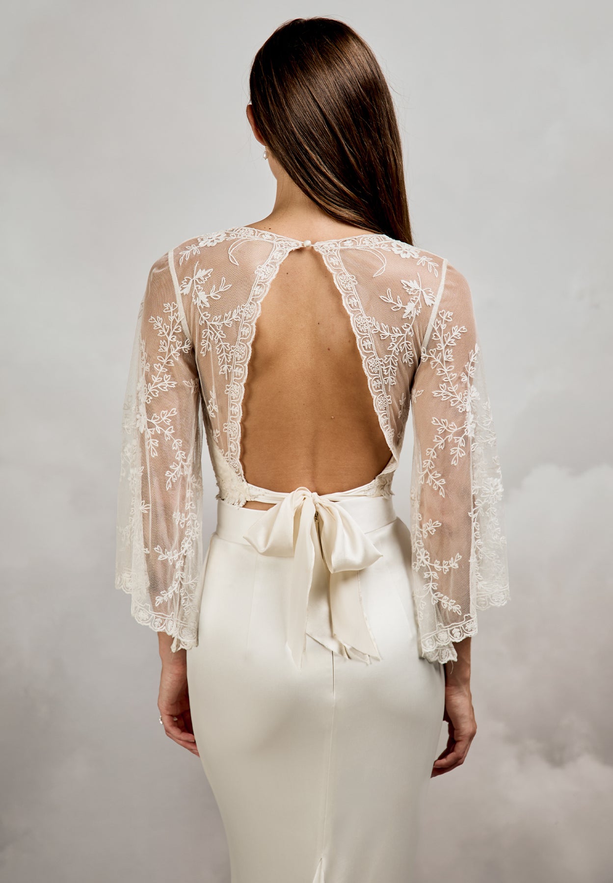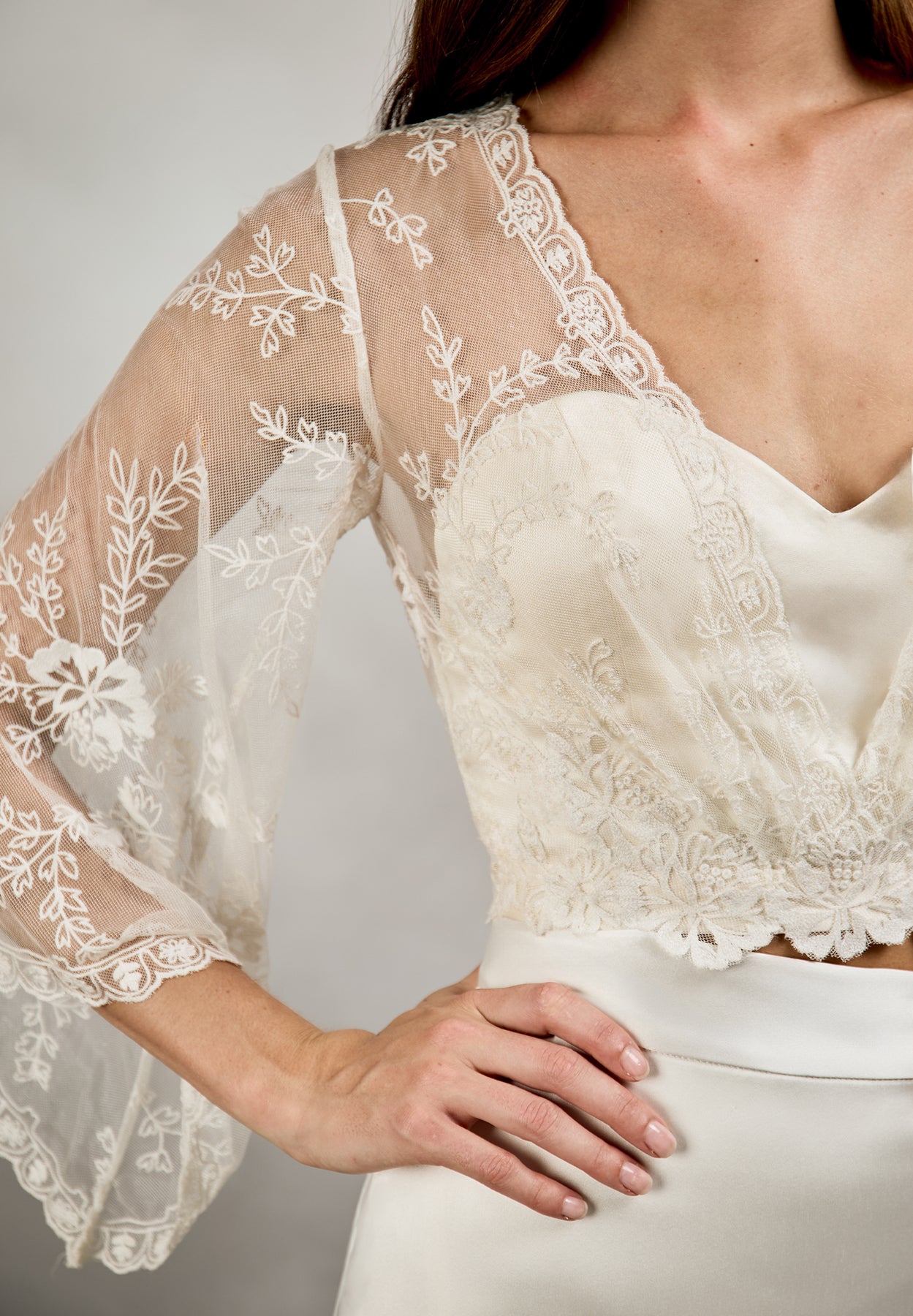 An iconic Catherine Deane archive piece, this is your last chance to say yes to the ethereal Muse Top. Designed for brides who appreciate artisanal detail and timeless romance, this limited-edition bridal top blends delicate craftsmanship with soft structure. The base layer features a romantic sweetheart neckline crafted from pale champagne 100% silk satin. Overlaid with soft tulle, this attached sheer layer showcases custom Catherine Deane hand embroidery, creating depth, texture, and an heirloom-quality finish. Elegant 3/4 length bell sleeves add movement and softness, while the back reveals a striking open keyhole detail, secured with a button at the centre back nape of the neck. Pale champagne silk satin ties fasten at the waist, allowing for an adjustable fit and beautifully defined shape.