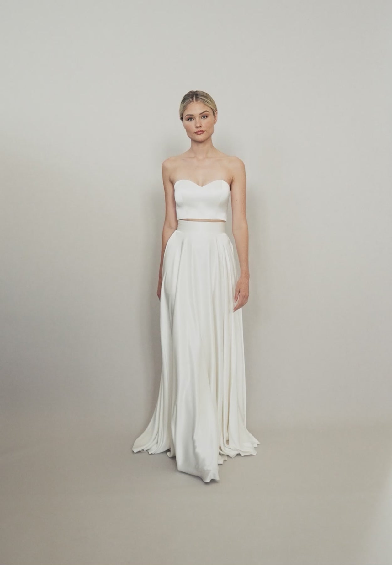 The luxurious, heavy satin Sestina Bodice is perfect for brides looking to create a modern bridal separates look. Concealed bust cups and boning add form-fitting structure to this slightly cropped top while the back opens with a fully openable zip. Opt to style this sweetheart neckline bodice with or without detachable skinny straps and with a skirt silhouette of your dreams.