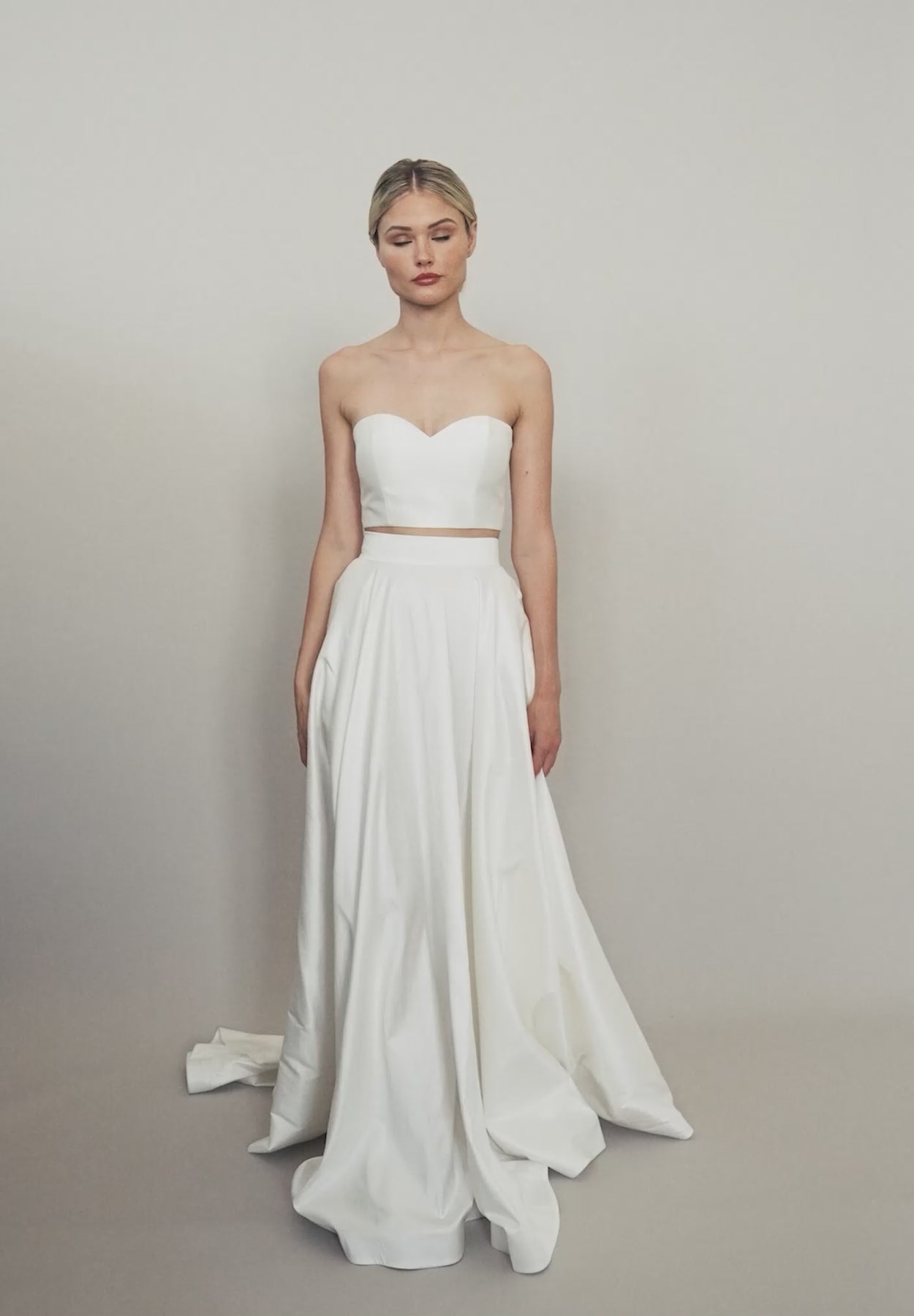 Simple, yet chic, the figure-hugging Sestina Bodice with its sweetheart neckline and cropped hemline pairs beautifully with an array of our bridal skirts and trousers. Cut from oyster-toned 100% silk Dupion that conceals built-in bust cups and boning, the center back of this effortless bridal top opens with a fully openable zip.