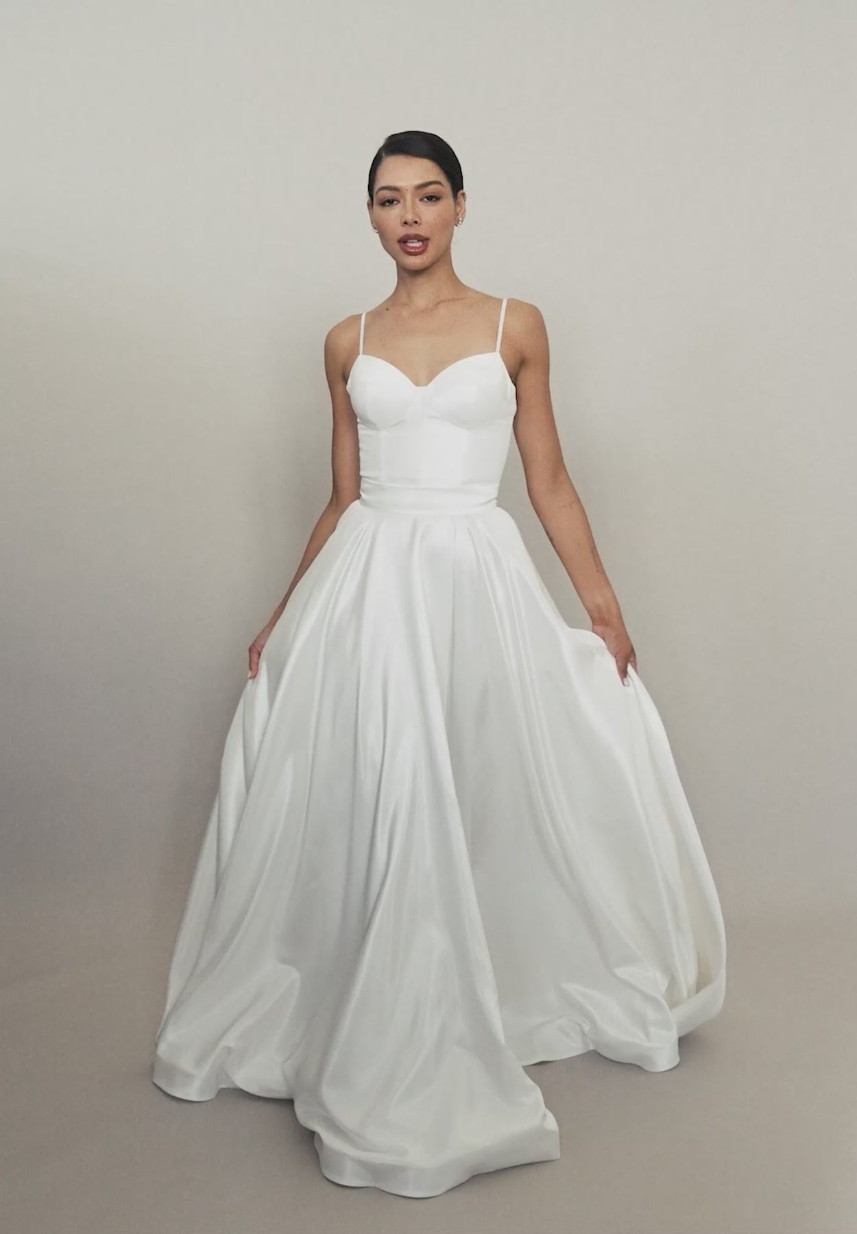 The Sia bodice is cut from crisp white Taffeta and features a structured, minimalist design that is perfect for styling with an array of our bridal skirts and trousers. The center back opens with covered buttons and loops, while built-in bust cups and boning add structure to this figure-hugging bridal top. Skinny straps add further support.