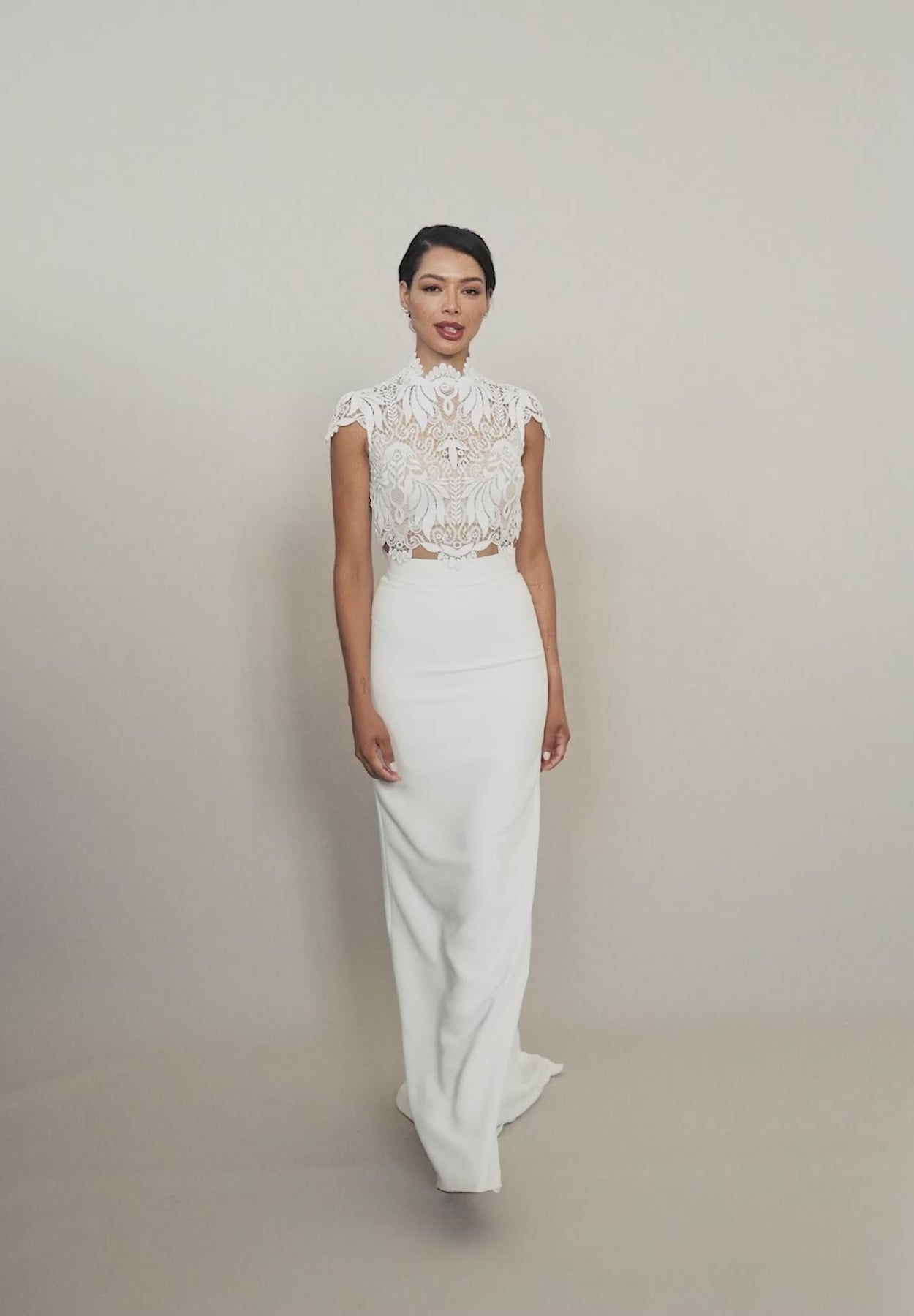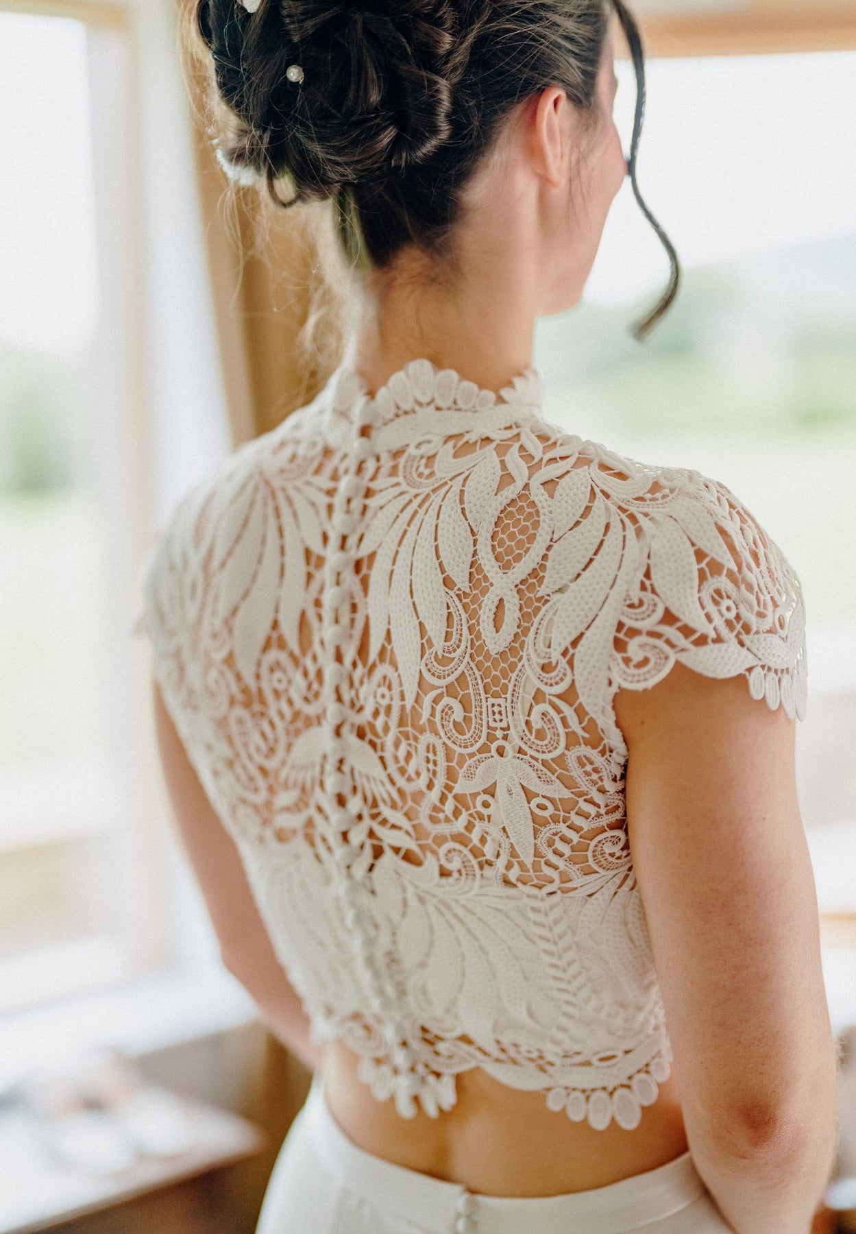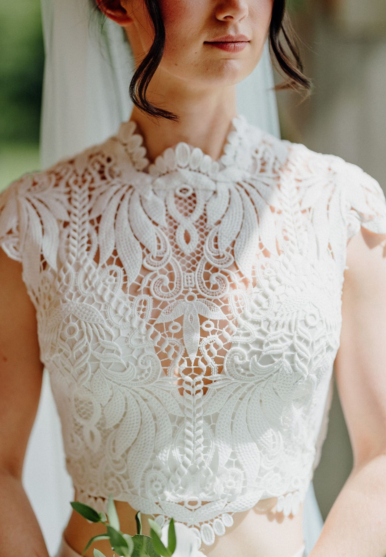 The Tori Topper is cut from a bold, oyster-coloured eco lace, featuring leaf and ladder motifs. The high, grown-on neckline, capped sleeves and slightly cropped hemline of this sheer topper are decorated with intricate scalloped details. Designed to be worn over a bralette of your choice, the center back of this topper opens with silk satin-covered buttons.