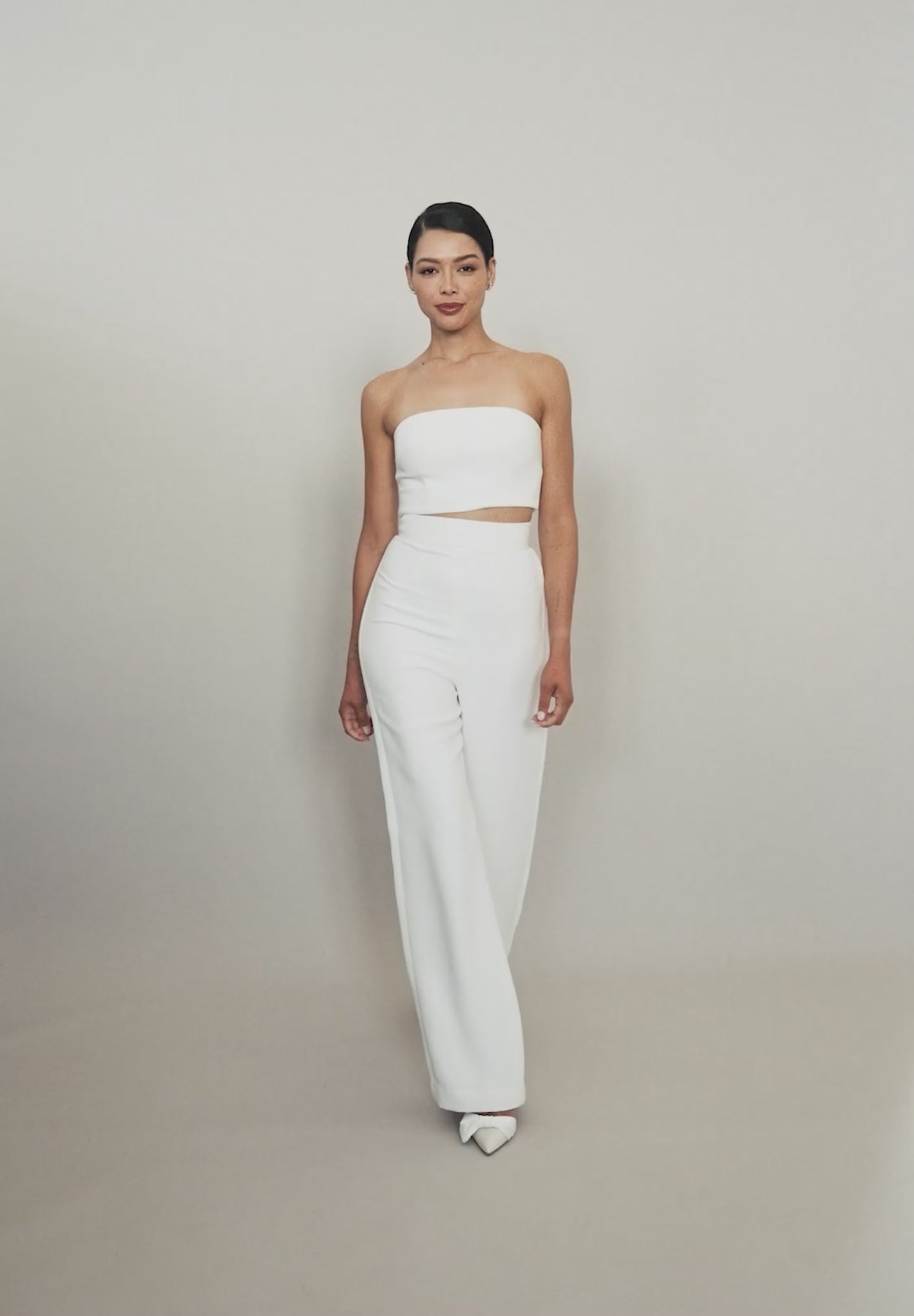 The modern Zia Bandeau is cut from bone white heavy crepe that lends a soft structure to this square neckline bustier. Bust cups and boning lend structure to the bodice while detachable skinny straps offer styling options. A secure, fully openable center back zip closes the center back for effortless dressing.